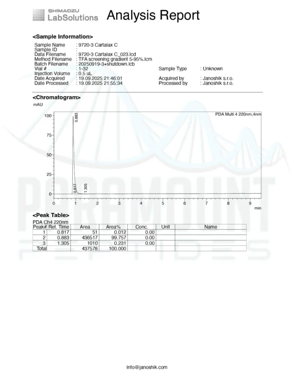 Supply as a lyophilised solid, Cartalax is designed for stability and consistency in laboratory environments. Store refrigerate at 2–8°C. Reconstitution and handling should follow standard laboratory protocols for peptide research.